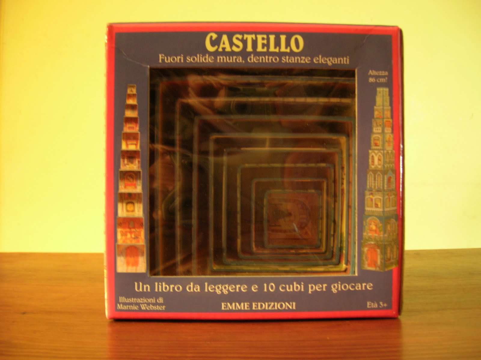 Uno de los últimos días en Roma, fuimos de paseo al Parco della Musica, en Roma, que es un gran centro cultural y de conciertos donde la pareja de Cris dirige el coro de niños. En ese lugar, además de un hermoso bar, hay una librería maravillosa con un importante sector de libros para niños. Así es que fue ahí donde, con la guía de Catalina, mi sobrina, encontramos el libro torre. En este caso se trataba de Castello. Fuori solide mura, dentro stanze eleganti (Castillo. Por fuera sólidos muros, adentro habitaciones elegantes) con ilustraciones de Marnie Webster, editado por Emme Edizioni, 2010.
