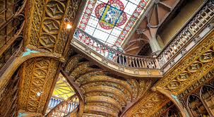 En el techo un vitral bellísimo que permite el paso de una luz diáfana, en el que se encuentra el exlibris de Lello & Irmao.