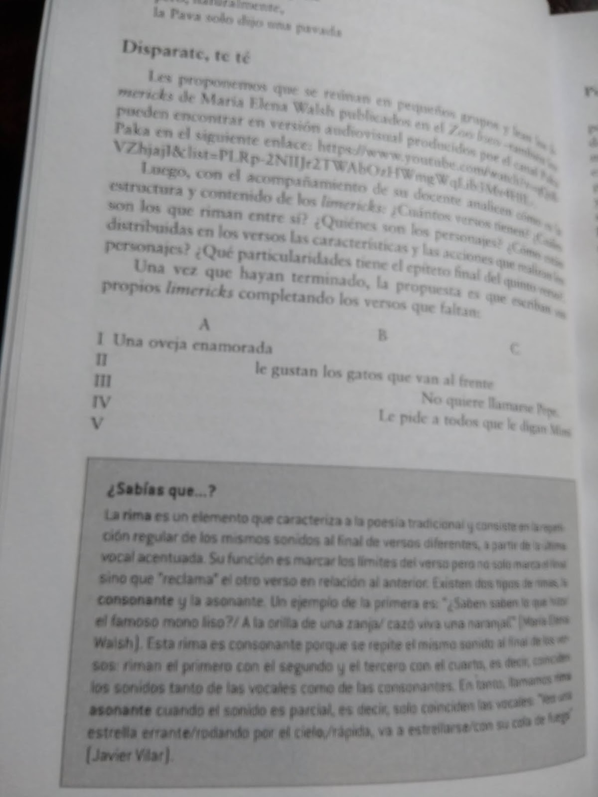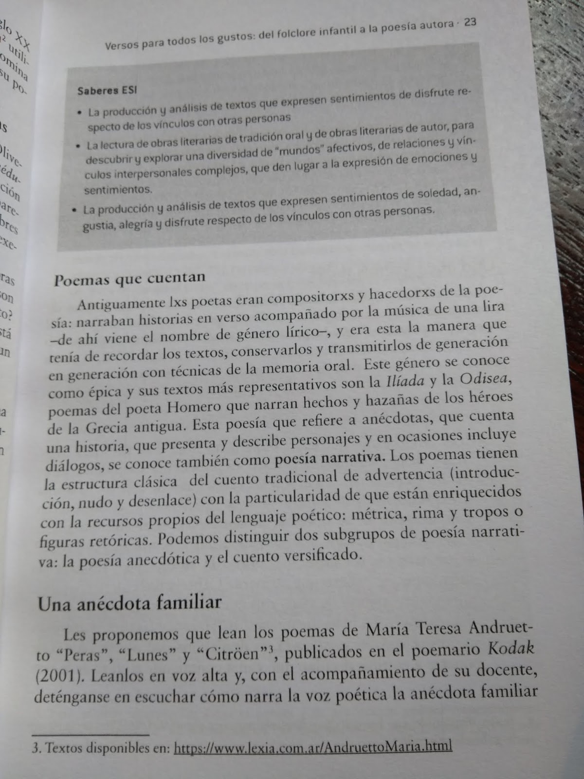 A lo largo de este capítulo como de todo el libro, se intercalan los Saberes de la ESI que se articulan con los textos literarios que se están abordando en las propuestas didácticas como así también nos encontramos con pequeñas pastillas con información sobre les autores y sobre el género poético.