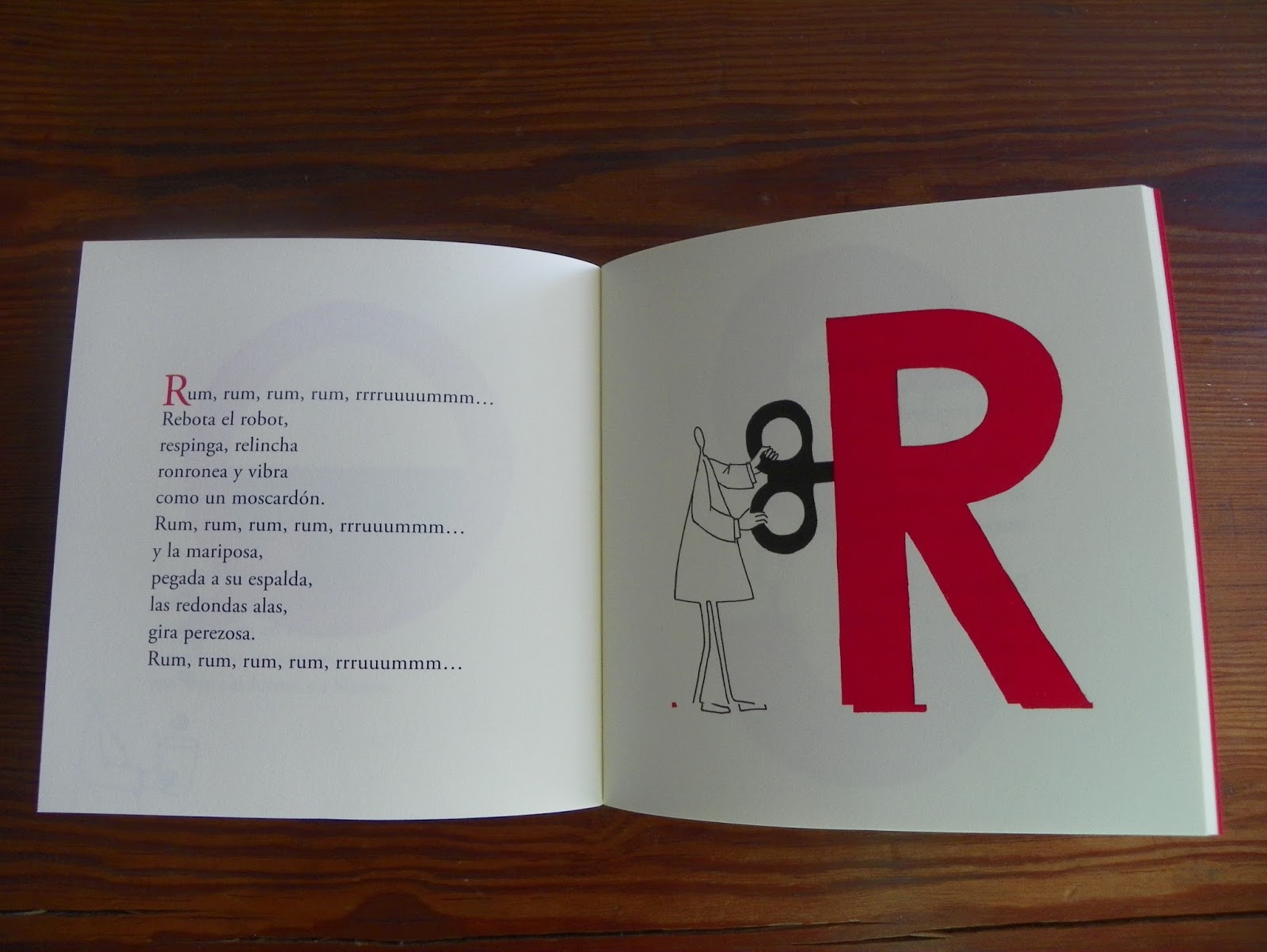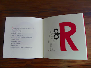En otros la letra es la oportunidad para construir un texto donde una palabra da origen a resemantizaciones, juegos de palabras o juegos sonoros como, por ejemplo, con la letra "R" donde el inicio del poema nos lleva a pronunciar la onomatopeya "rum, rum..." y, a partir de allí, acciones y personajes que suenan con la r y con ese sonido de ronroneo.